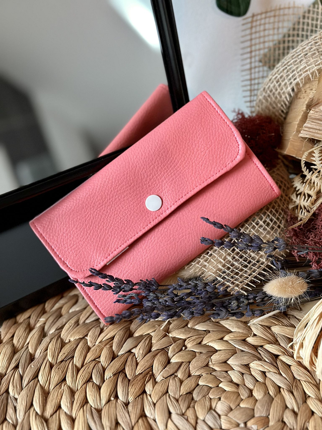 Il se situe à mi-chemin entre le porte-monnaie et le portefeuille. Son soufflet permet une large ouverture et la pochette zippée centrale crée deux espaces de rangement, pour emmener avec vous le strict nécessaire qui est souvent bien suffisant !